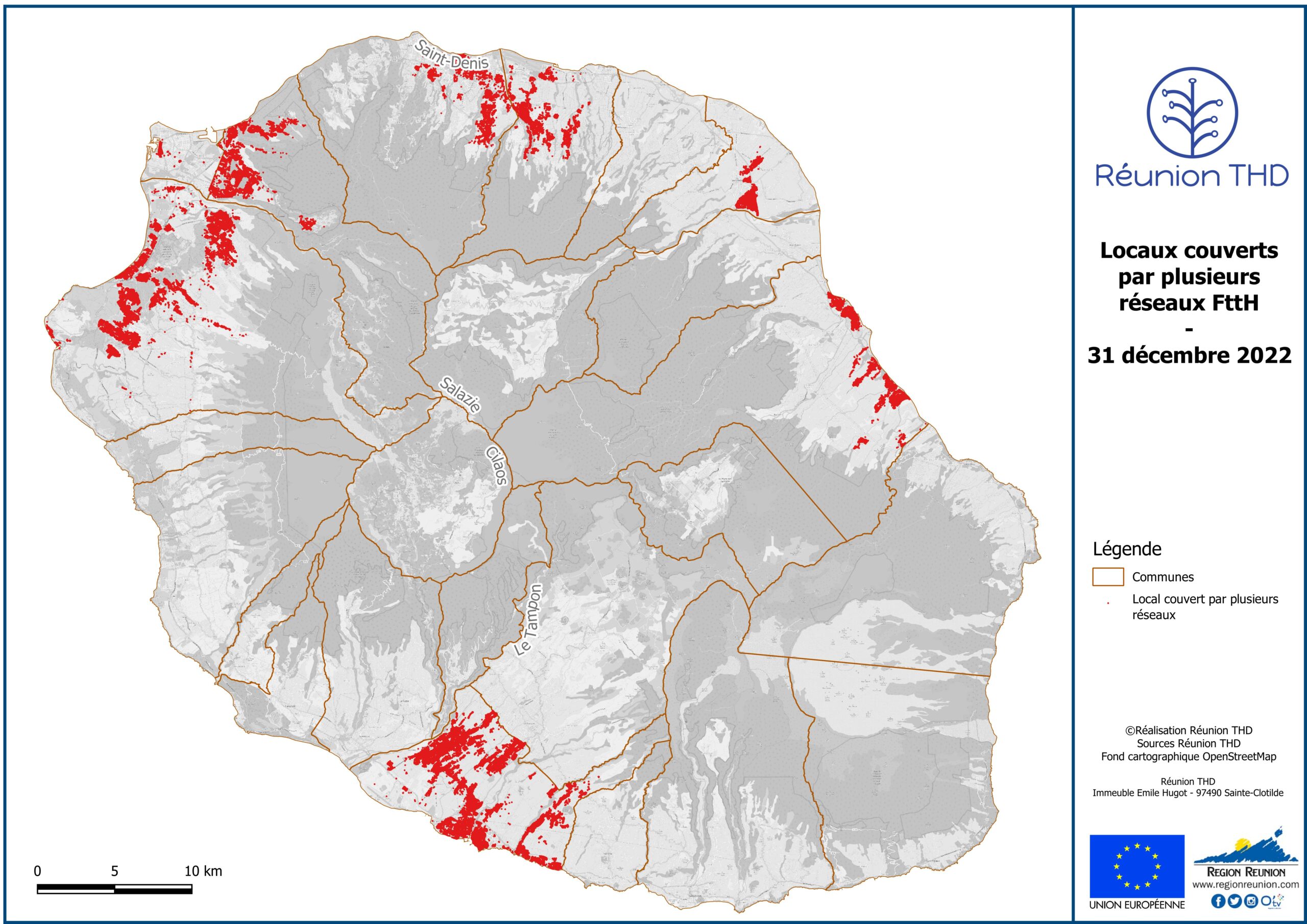 Carte des locaux desservis par plusieurs réseaux FttH (source Réunion THD)