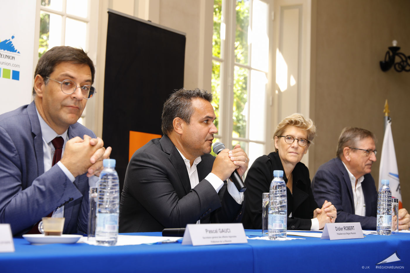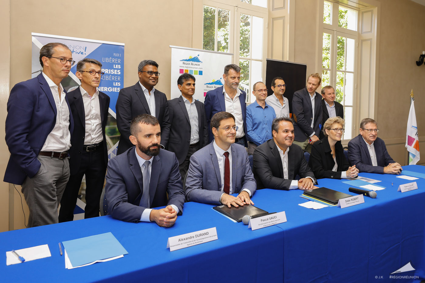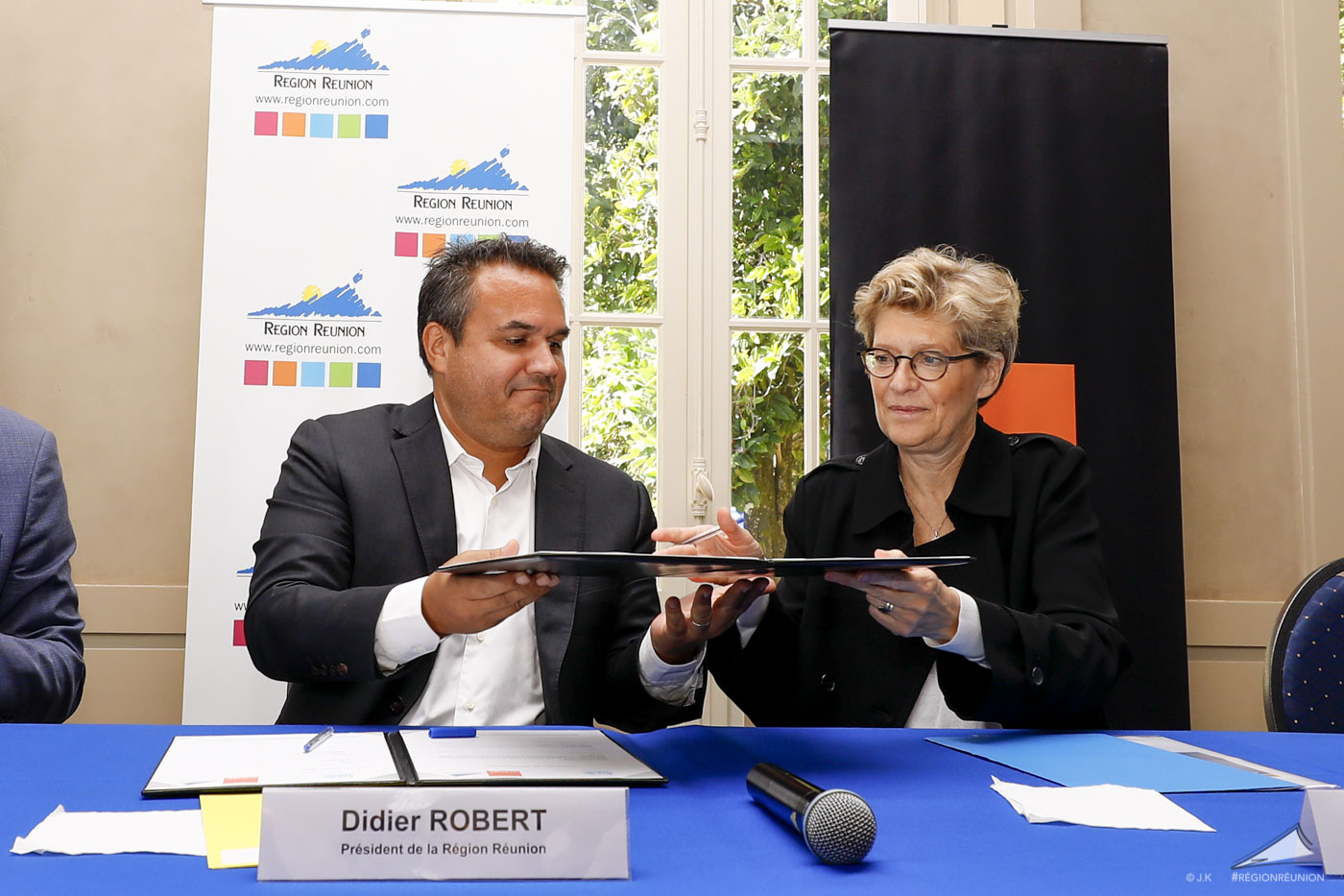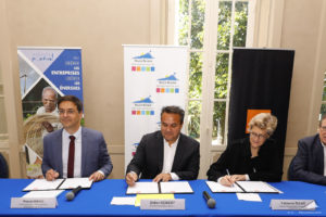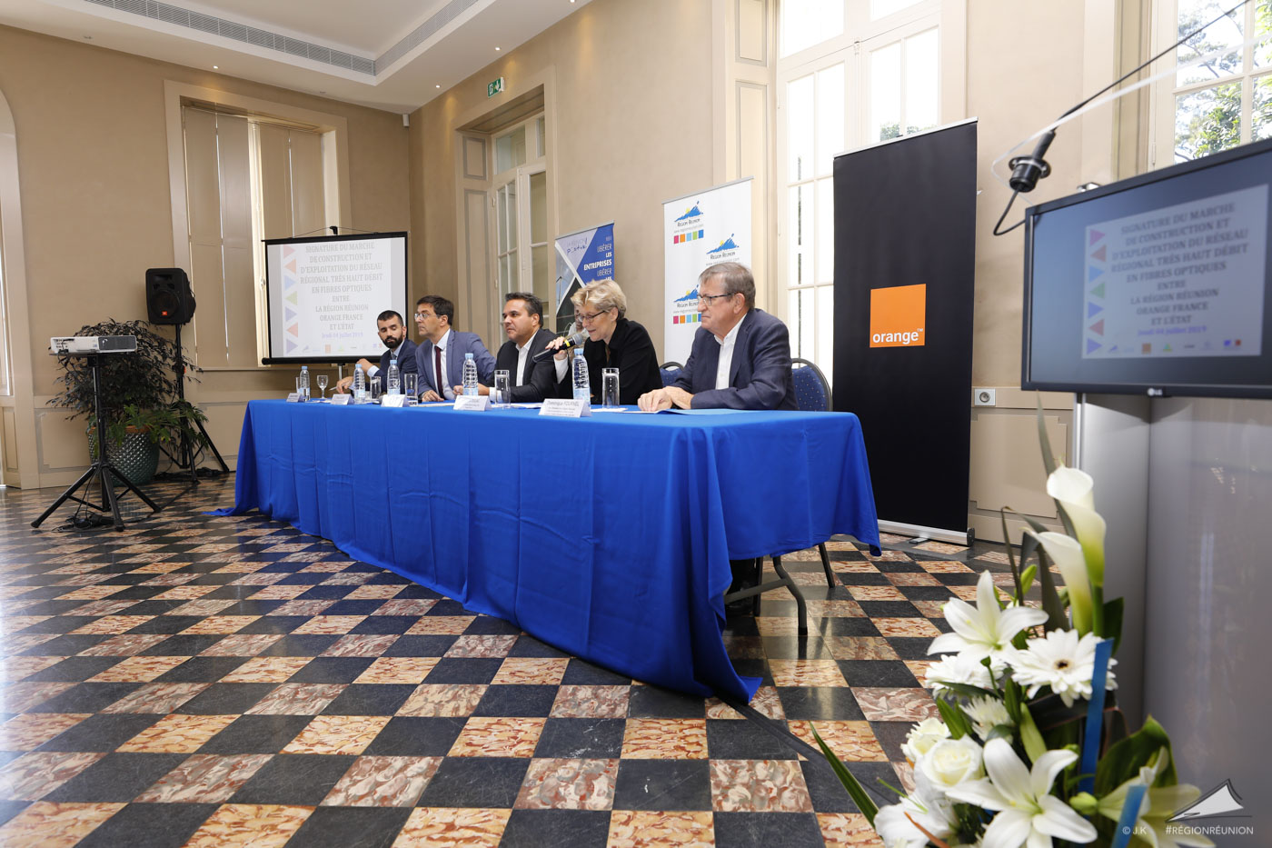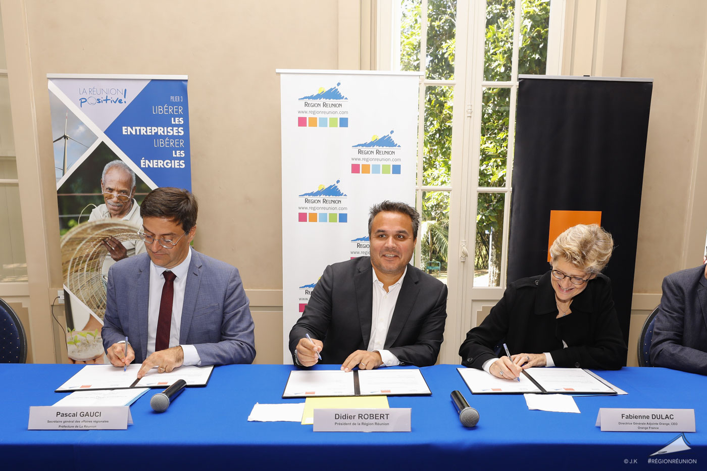 Le Président de Région Didier Robert et La Directrice Générale Adjointe d’Orange et CEO d’Orange France, Fabienne Dulac officialisent le lancement du déploiement de la Fibre pour La Réunion dans le cadre du projet de la Région en présence du Secrétaire Général aux Affaires Régionales, Pascal Gauci.