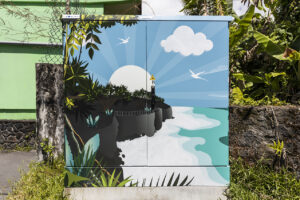 Nous avons conçu des habillages graphiques représentant votre commune ou votre environnement le plus proche. Ainsi vous pourrez découvrir une magnifique case créole à l’Entre Deux, retrouver la fabuleuse cascade du voile de la mariée au cœur d’ HellBourg, le Cap Méchant sur la route du Tremblet, ou encore l’Eglise Notre Dame des Laves à Sainte Rose. La forêt des Makes s’invite aux Avirons pour le plus grand plaisir des résidents du quartier et des lycéens. Dénichez la route aux 400 virages qui s’est cachée à Bras Sec.